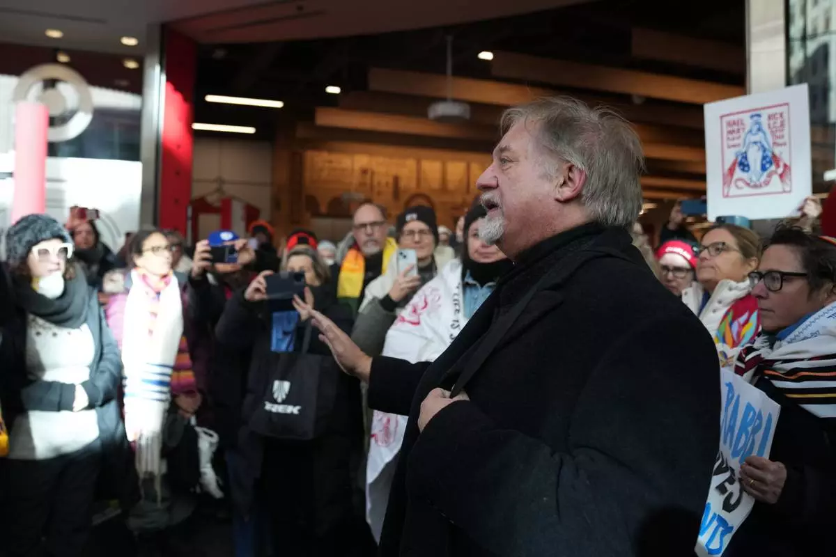 CORRECTS NAME SPELLING: Rabbi Sharon Kleinbaum and protesters put on their talents as they gather at Target, Friday, Jan. 23, 2026, in Minneapolis. (AP Photo/Abbie Parr)