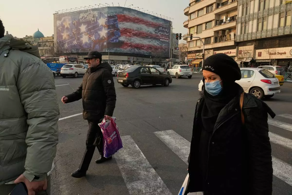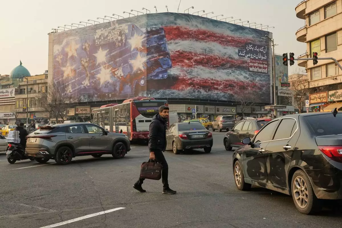 DUBAI, United Arab Emirates (AP) — Iranian authorities unveiled a new mural on a giant billboard in a central Tehran square on Sunday with a direct warning to the United States to not attempt a military strike on the country, as U.S. warships head to the region.
