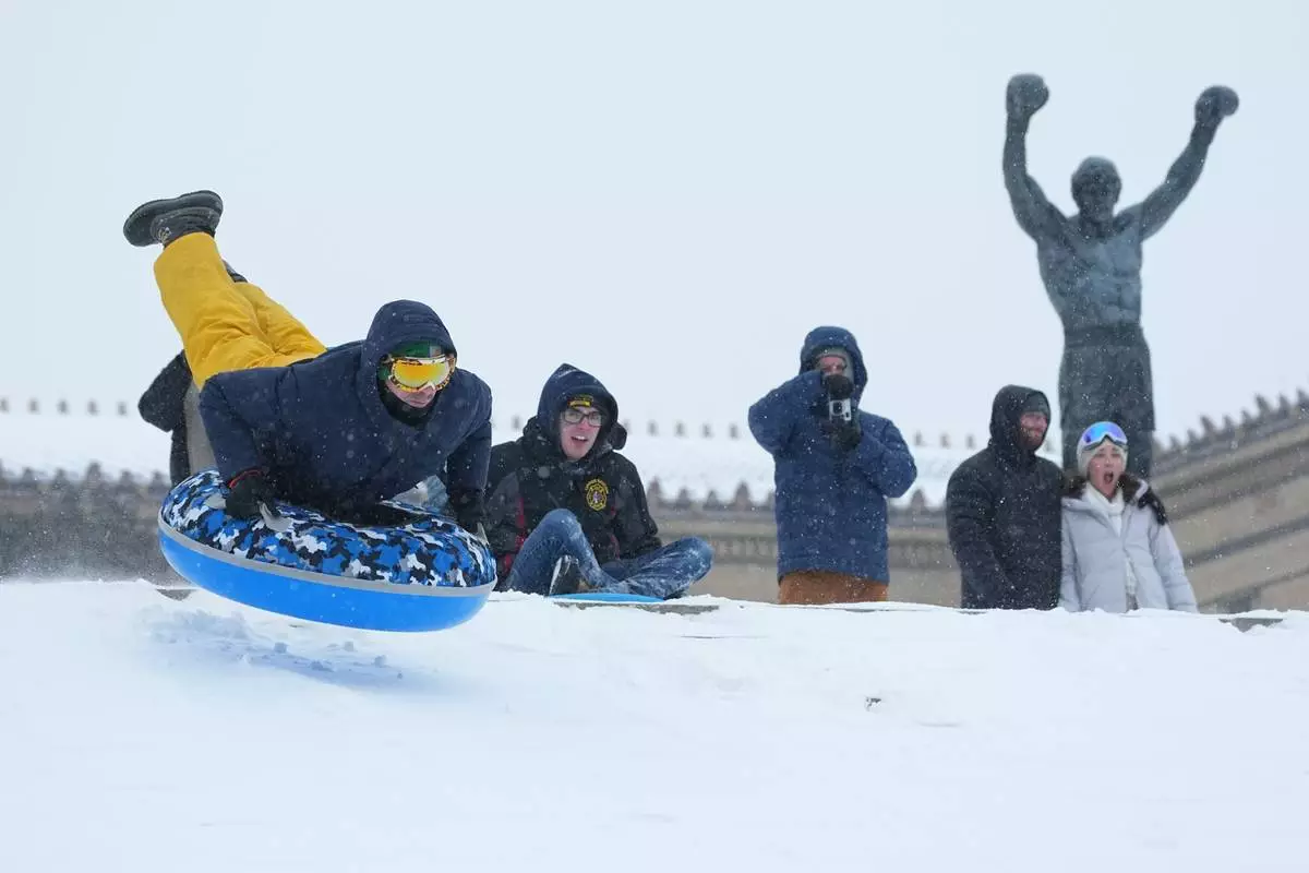 People sled at Philadelphia Art Museum steps by the Rocky statue during a winter storm in Philadelphia, Sunday, Jan. 25, 2026. (AP Photo/Matt Rourke)