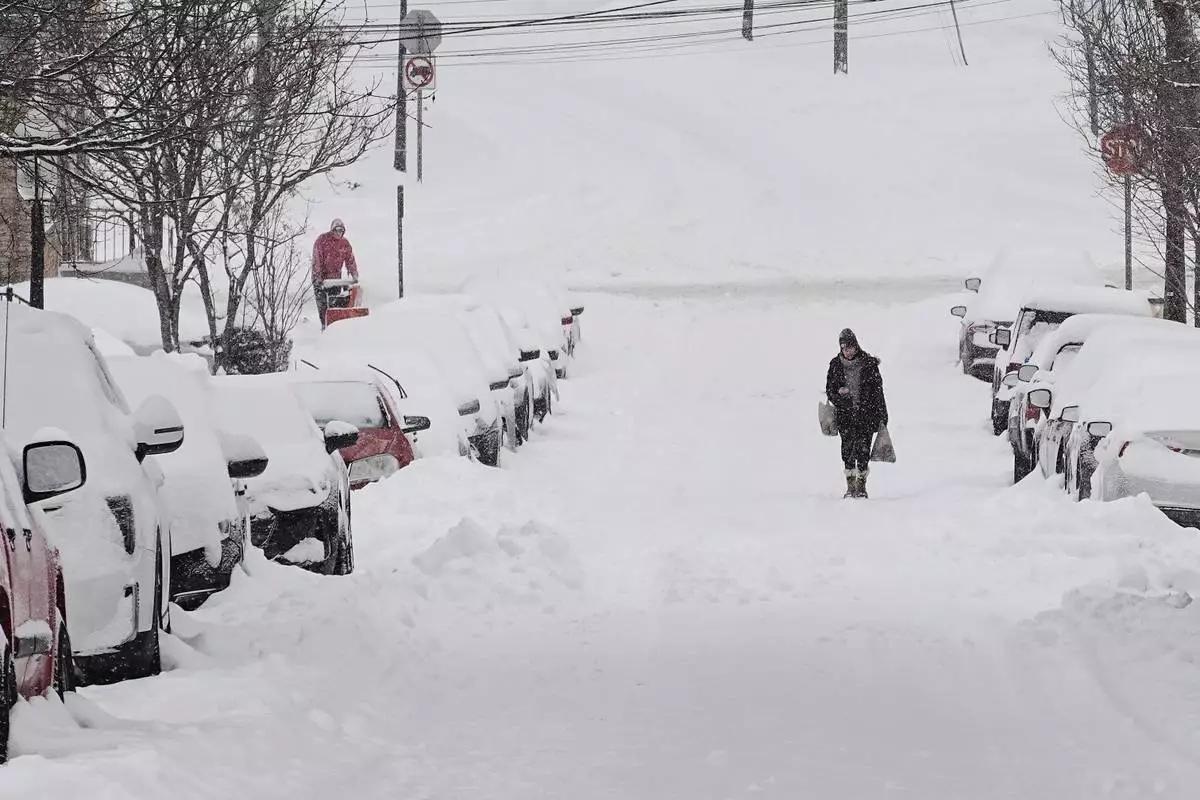 A person carries grocery bags up a residential street during a winter storm Sunday, Jan. 25, 2026, in Cincinnati. (AP Photo/Joshua A. Bickel)