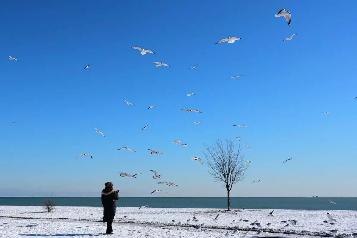 A person stands on a snow-covered ground along Lake Michigan as birds fly overhead at Montrose beach in Chicago, Wednesday, Jan. 28, 2026. (AP Photo/Nam Y. Huh)
