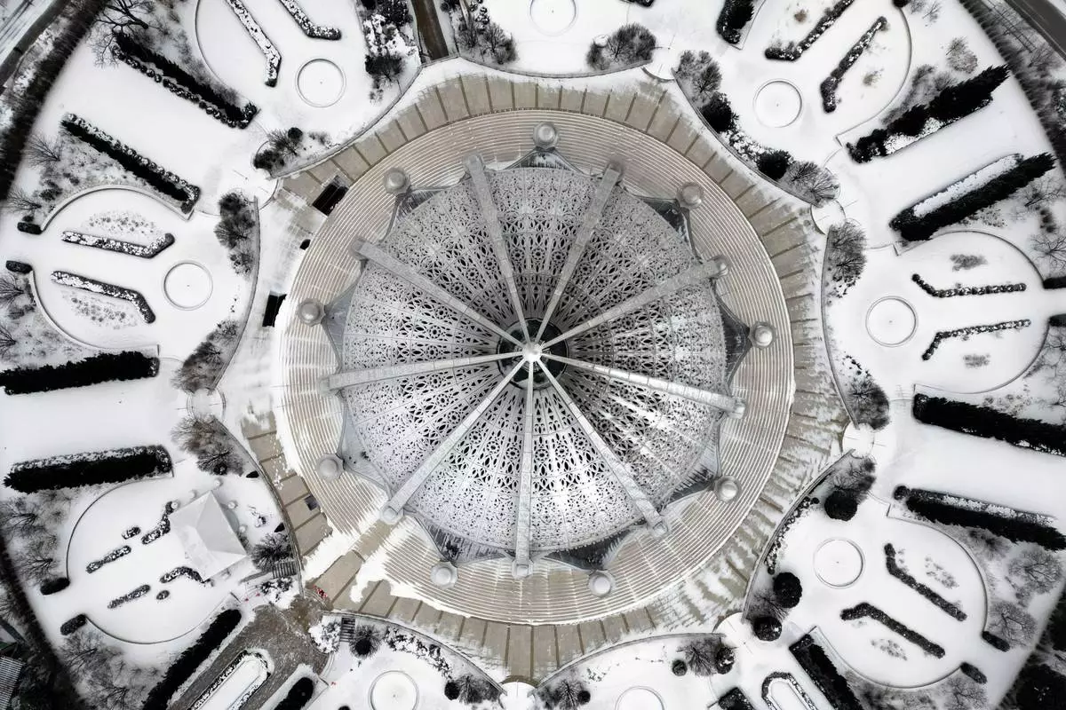 The Baháʼí House of Worship is seen from above on a snowy Friday, Jan. 30, 2026, in Wilmette, Ill.. (AP Photo/Erin Hooley)