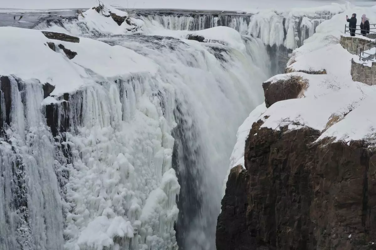 People look over the partial frozen Great Falls in Paterson, N.J., Wednesday, Jan. 28, 2026. (AP Photo/Seth Wenig)