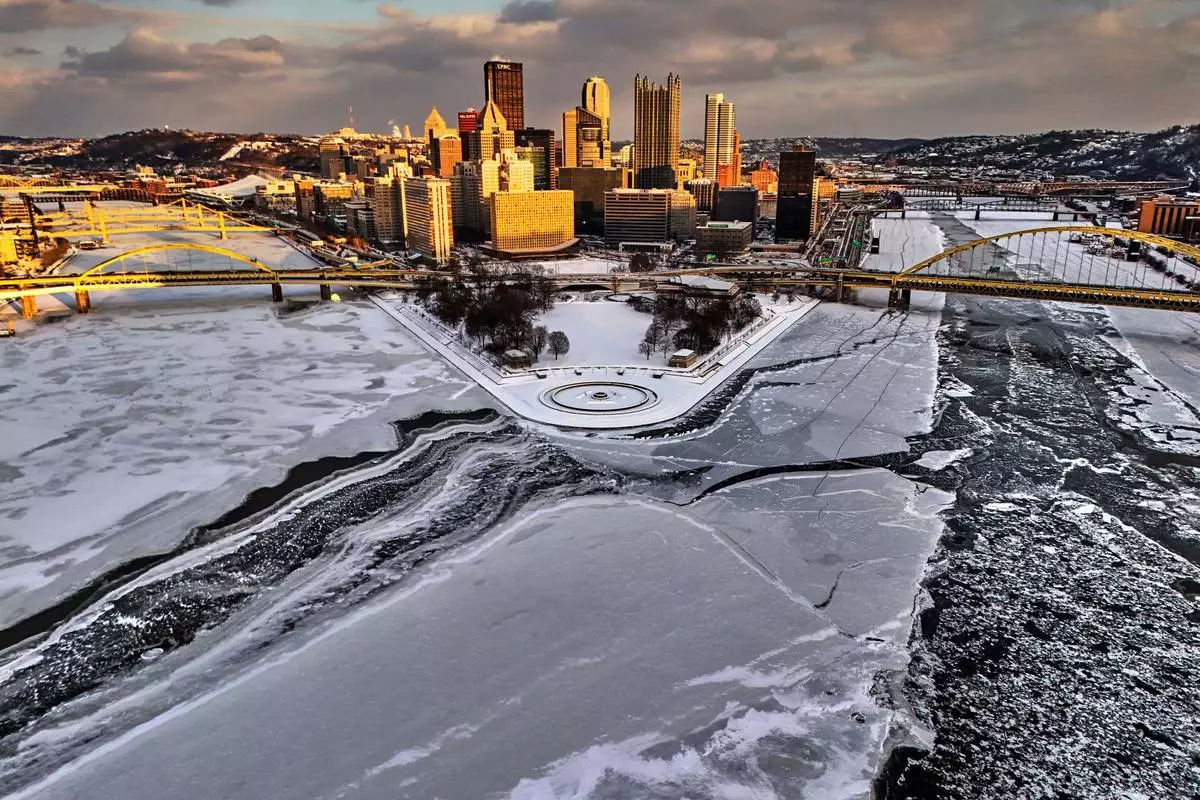 Ice covers the confluence of the Allegheny, left, Ohio, center, and Monongahela Rivers at the Point State Park in downtown Pittsburgh, Jan. 28, 2026. (AP Photo/Gene J. Puskar)