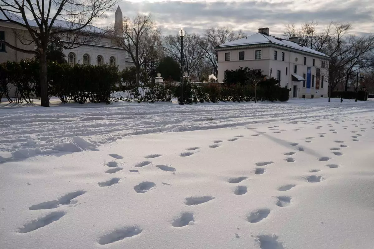 Footprints mark the snow in Washington, Monday, Jan. 26, 2026. (AP Photo/Allison Robbert)