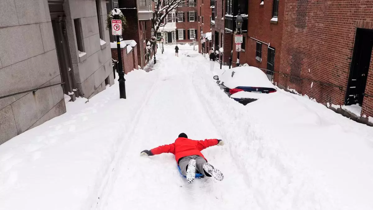 Ian Flood sleds down a street in his Beacon Hill neighborhood following a winter storm that dump more than a foot of snow across the region, Monday, Jan. 26, 2026, in Boston. (AP Photo/Charles Krupa)