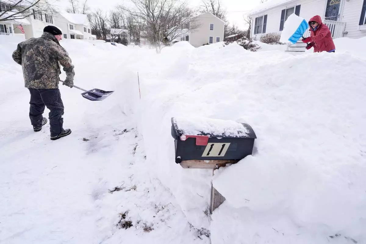 Todd Thibaud, left, and his wife Susan dig out their driveway and walkway following a winter storm that dumped more than a foot and a half of snow across the region, Tuesday, Jan. 27, 2026, in Haverhill, Mass. (AP Photo/Charles Krupa)