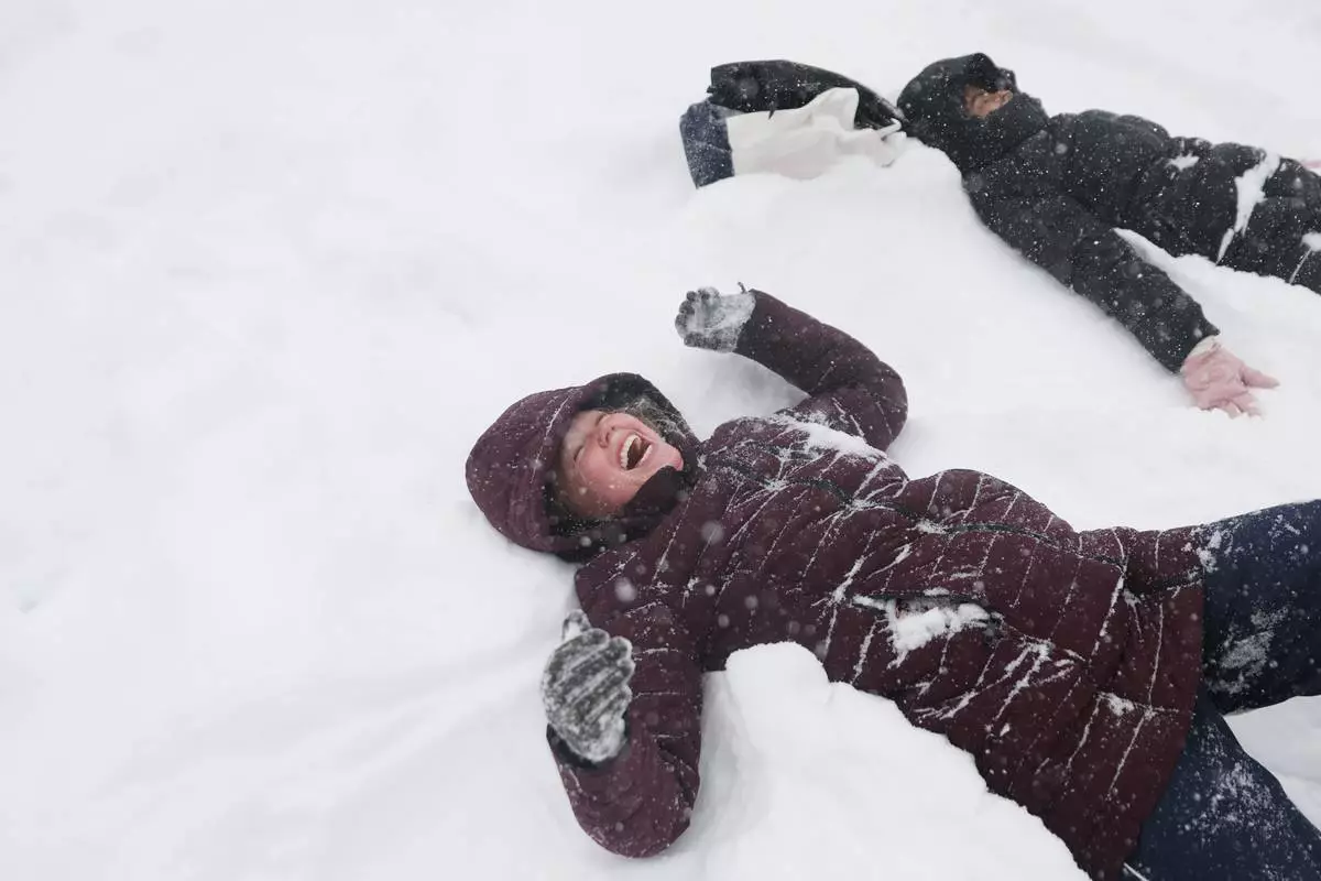 Sadie Eidson, left, laughs while playing in the snow in Central Park during a winter storm, Sunday, Jan. 25, 2026, in New York. (AP Photo/Heather Khalifa)
