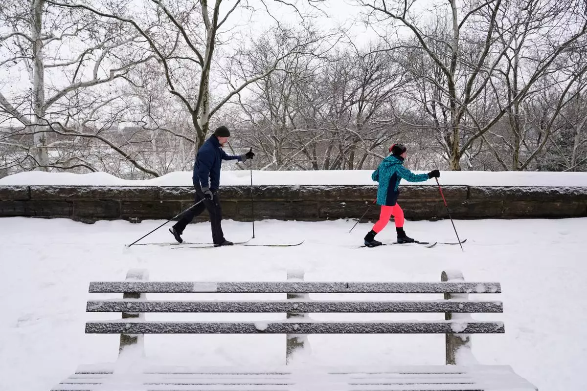 Melissa Welsh and Kevin Daly ski in Riverside Park in New York, Monday, Jan. 26, 2026. (AP Photo/Seth Wenig)