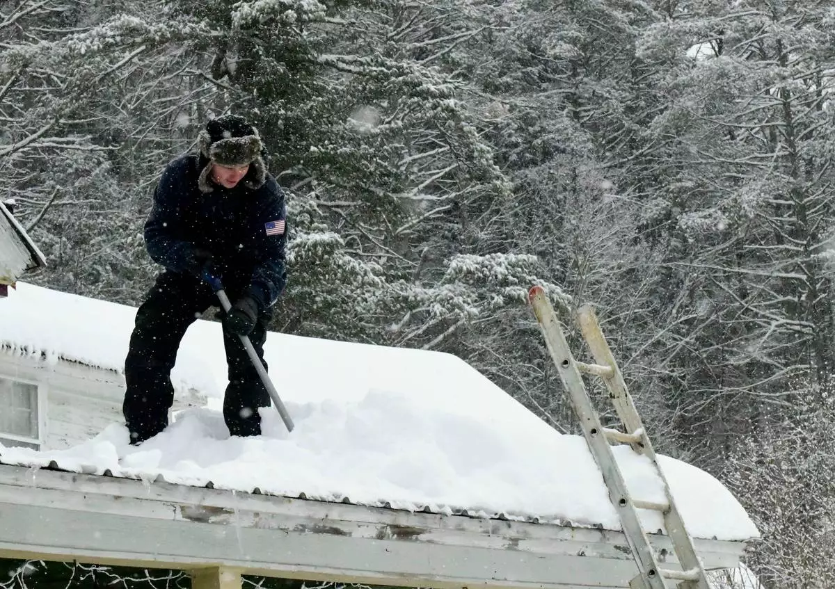 Jack Grimes shovels snow off his roof before it could do damage to the building on Monday, Jan. 26, 2026, in Wardsboro, Vt., after Winter Storm Fern dropped several inches of snow. (Kristopher Radder/Brattleboro Reformer via AP)