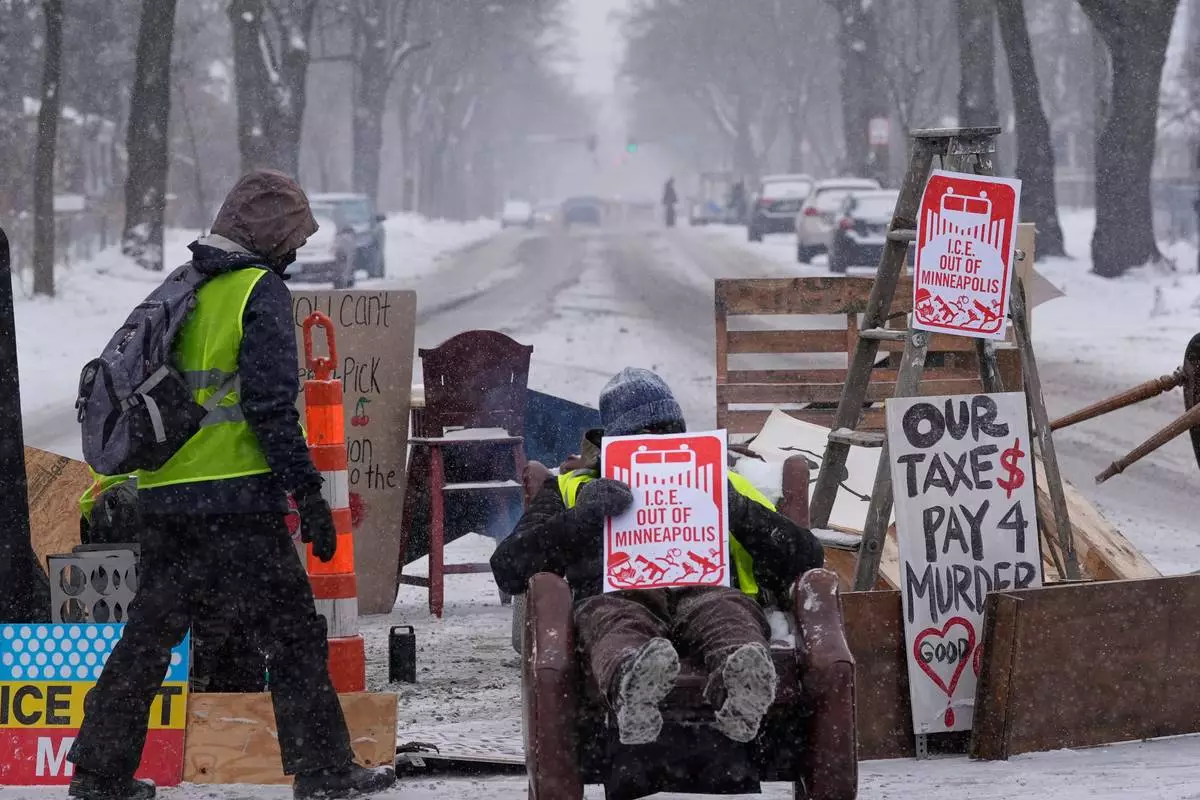 A person walks near a blockade set up to deter federal immigration enforcement vehicles In Minneapolis, Sunday, Feb. 1, 2026. (AP Photo/Alex Brandon)