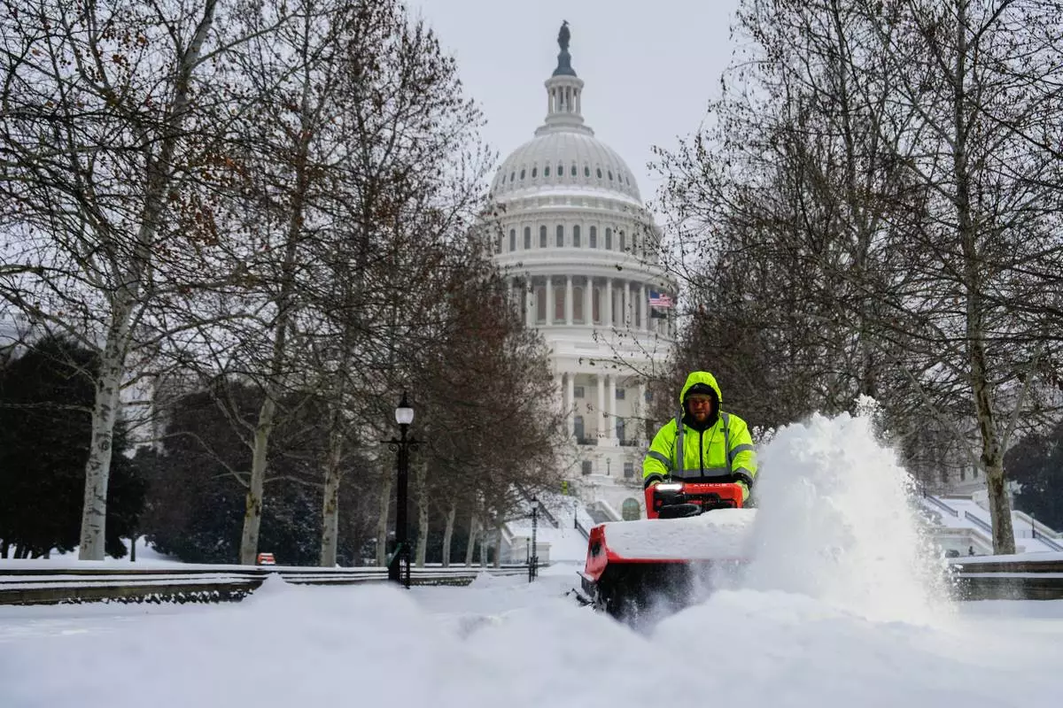 Architect of the Capitol workers clear snow outside the U.S. Capitol, Sunday, Jan. 25, 2026, in Washington. (AP Photo/Julia Demaree Nikhinson)