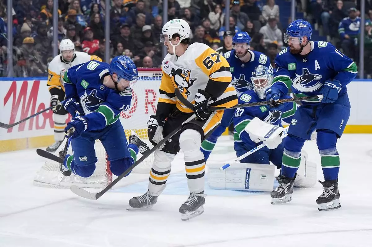 Vancouver Canucks' Elias Pettersson (40) falls in front of Pittsburgh Penguins' Rickard Rakell (67) as Canucks' Filip Hronek (17) and goalie Kevin Lankinen (32) watch during second-period NHL hockey game action in Vancouver, British Columbia, Sunday, Jan. 25, 2026. (Darryl Dyck/The Canadian Press via AP)