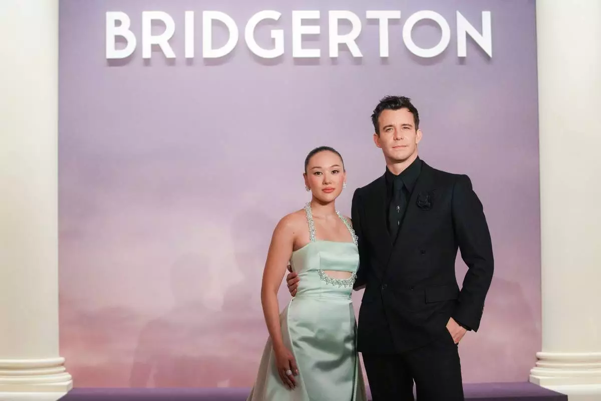 Yerin Ha and Luke Thompson arrive for the World premiere of "Bridgerton" season 4 on Wednesday, Jan. 14, 2026 in Paris. (AP Photo/Christophe Ena)
