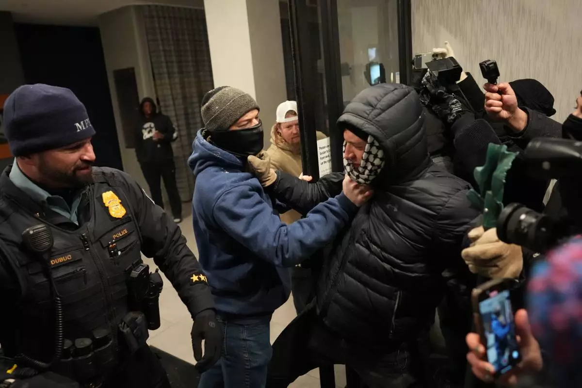 A man, center left, next to a Minneapolis police officer grabs a protester in the doorway during a noise demonstration protest in response to federal immigration enforcement operations in the city Sunday, Jan. 25, 2026, in Minneapolis. (AP Photo/Adam Gray)