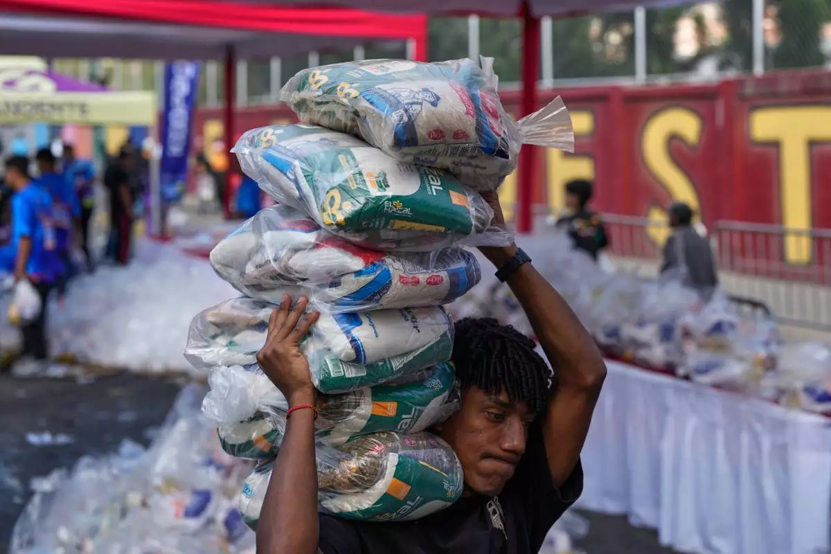 A worker carries bags of food at a government-subsidized market in Caracas, Venezuela, Sunday, Jan. 25, 2026. (AP Photo/Ariana Cubillos)