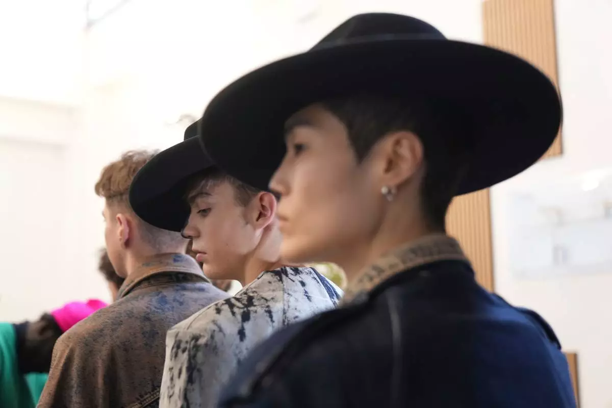 Models get ready in the backstage of the Victor Hart Fall/Winter 2026-2027 Men's fashion show presented in Milan, Italy, Jan. 18, 2026. (AP Photo/Antonio Calanni)