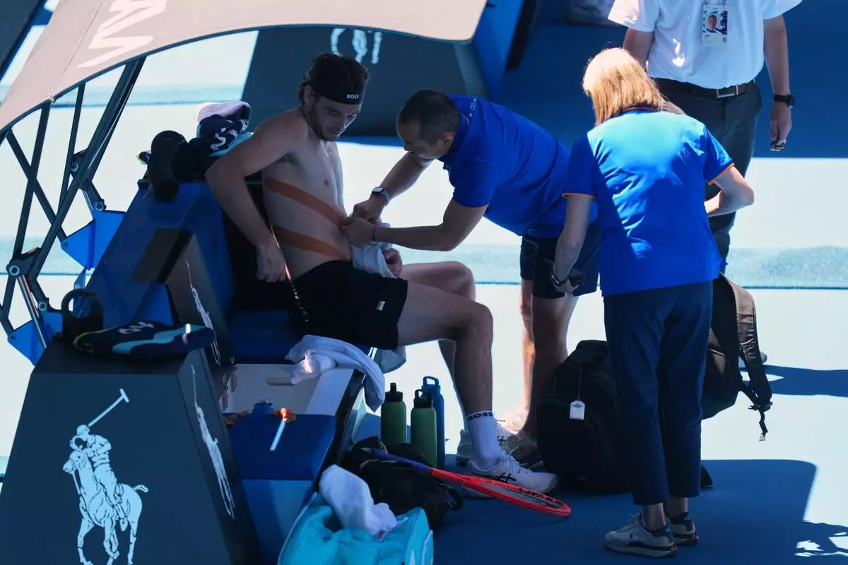 Taylor Fritz of the U.S. receives medicall attention as he plays against Lorenzo Musetti of Italy during their fourth round match at the Australian Open tennis championship in Melbourne, Australia, Monday, Jan. 26, 2026. (AP Photo/Mark Baker)