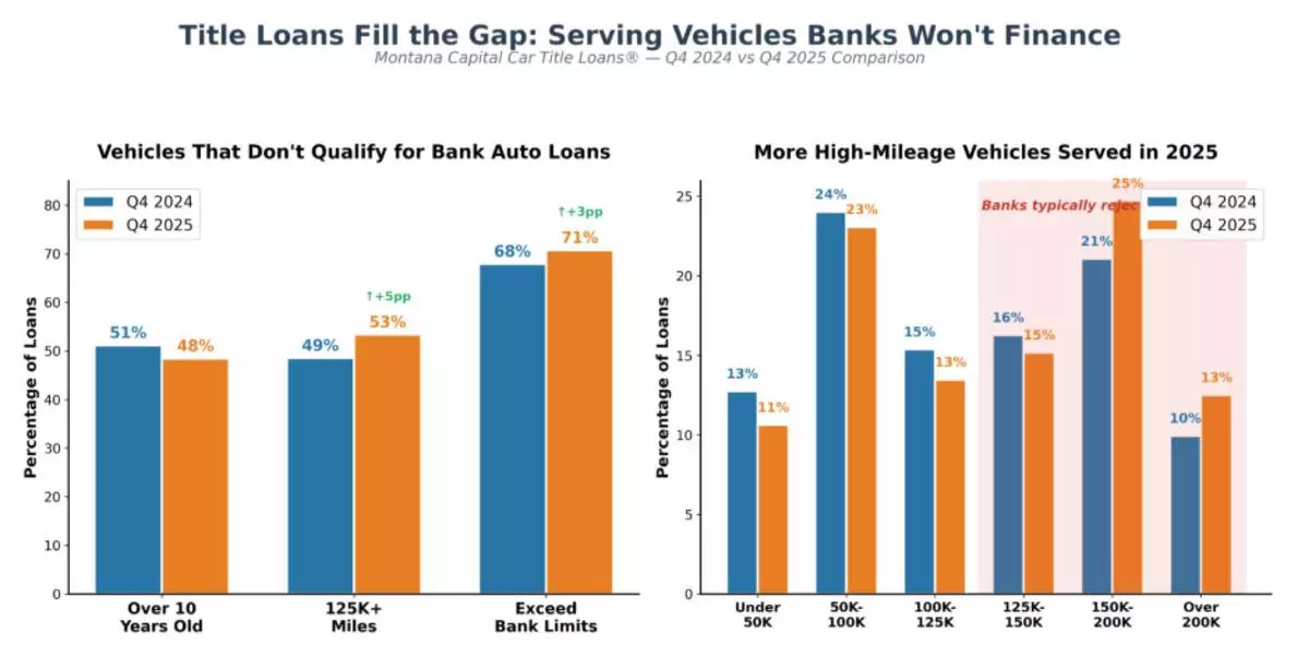 Montana Capital Car Title Loans® released year-over-year Q4 lending data showing an increase in vehicles that no longer meet bank auto loan requirements, including age and mileage thresholds.
