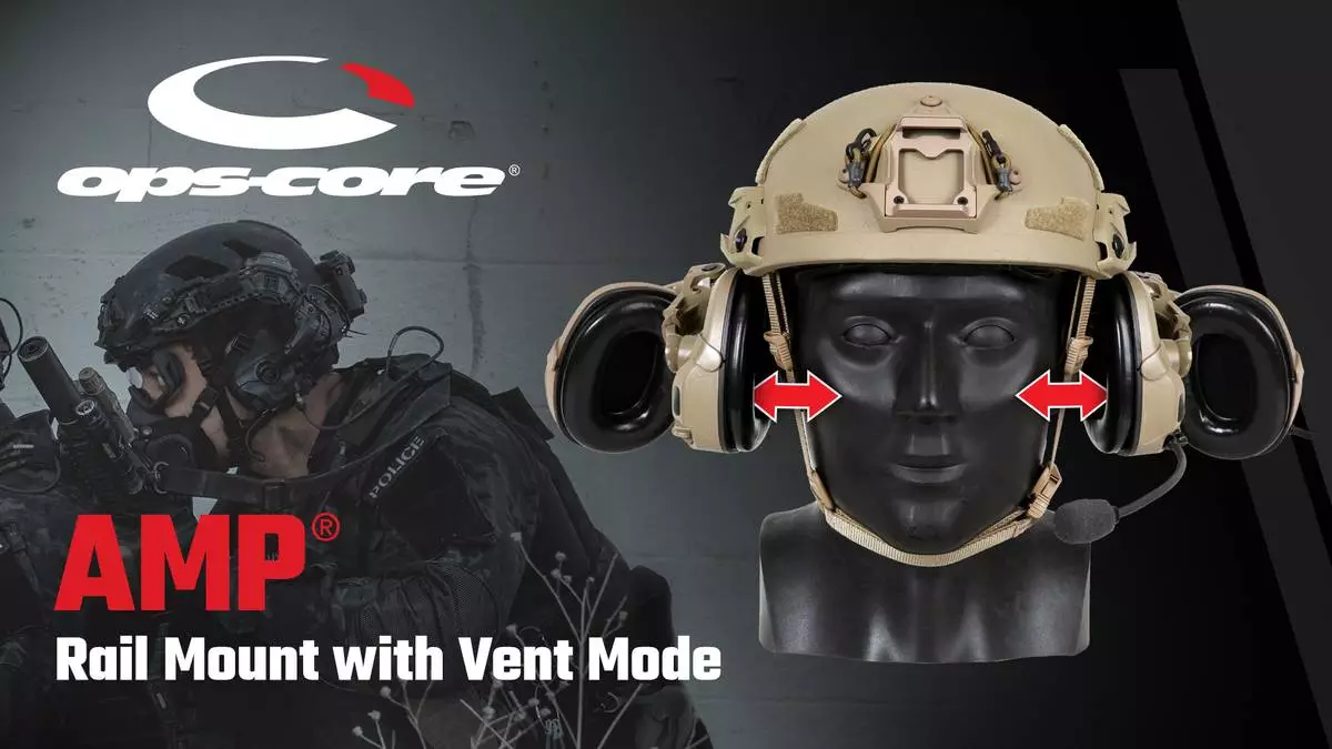 The new rail mount maintains the same familiar form factor, world-class durability and rugged performance as the original AMP Rail Mount. It is designed to offer increased stability during dynamic movements and remains fully compatible with Ops-Core NFMI Earplugs for double hearing protection. The AMP Rail Mount with Vent Mode is available in three colors: tan 499, black, and ranger green.