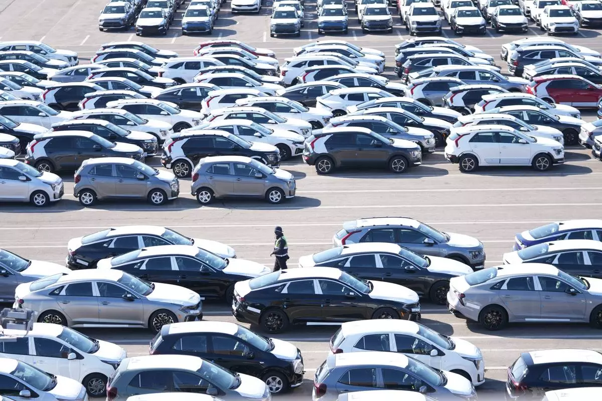 Vehicles for export are parked at a port in Pyeongtaek, South Korea, Tuesday, Jan. 27, 2026. (AP Photo/Lee Jin-man)