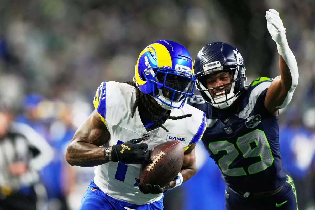 Los Angeles Rams wide receiver Davante Adams (17) catches a ball past Seattle Seahawks cornerback Josh Jobe (29) during the second half of the NFC Championship NFL football game Sunday, Jan. 25, 2026, in Seattle. (AP Photo/Stephen Brashear)
