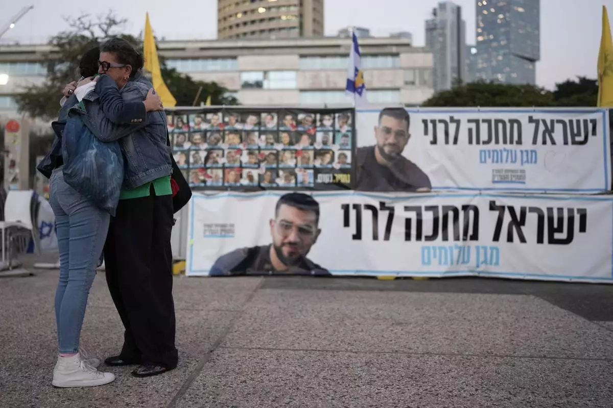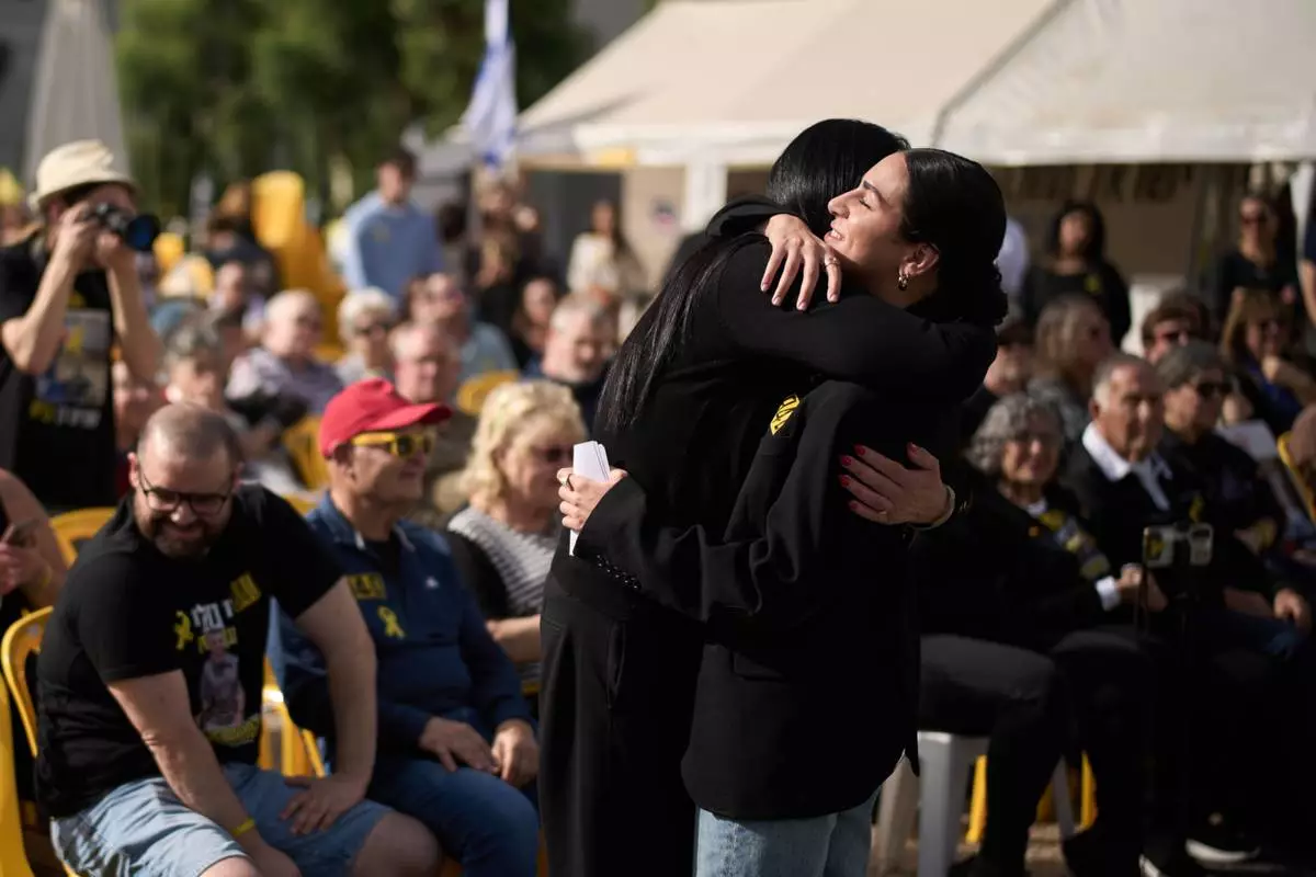 Shira Gvili, right, embraces her mother Talik during a rally calling for the return of her brother Ran Gvili, who was killed while fighting Hamas militants during the Oct. 7, 2023 attack and whose body has been held in Gaza ever since, in Tel Aviv, Israel, Friday, Jan. 23, 2026. (AP Photo/Leo Correa)