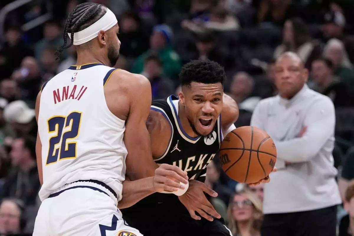 Milwaukee Bucks' Giannis Antetokounmpo tries to get past Denver Nuggets' Zeke Nnaji during the second half of an NBA basketball game Friday, Jan. 23, 2026, in Milwaukee. (AP Photo/Morry Gash)