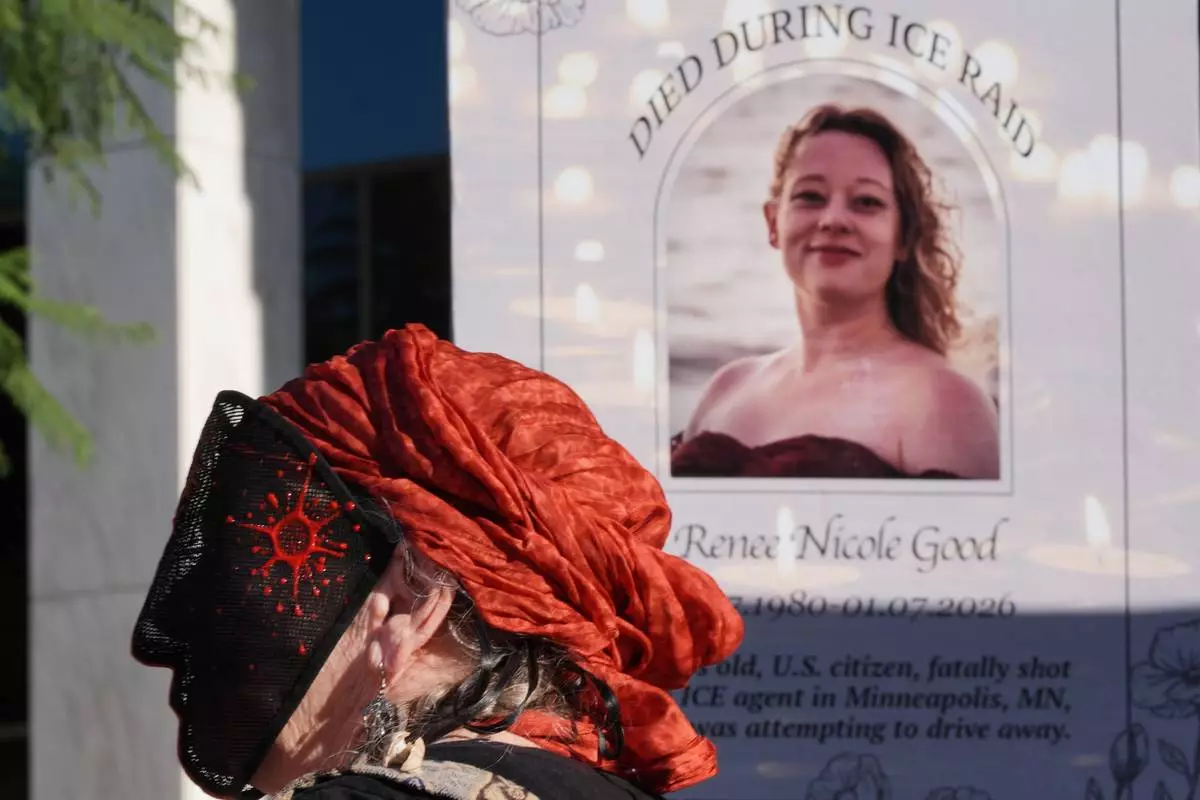 A demonstrator wears a mask in front of an image of Renee Good during a protest to denounce the Trump administration's immigration enforcement polices Friday, Jan. 16, 2026, in Los Angeles. (AP Photo/Jae C. Hong)