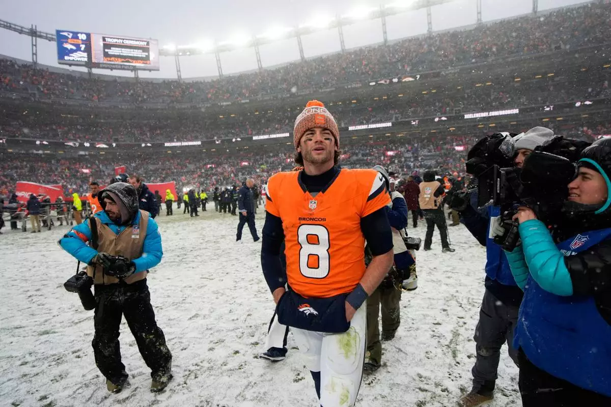 Denver Broncos quarterback Jarrett Stidham leaves the field after the AFC Championship NFL football game between the Denver Broncos and the New England Patriots, Sunday, Jan. 25, 2026, in Denver. (AP Photo/John Locher)
