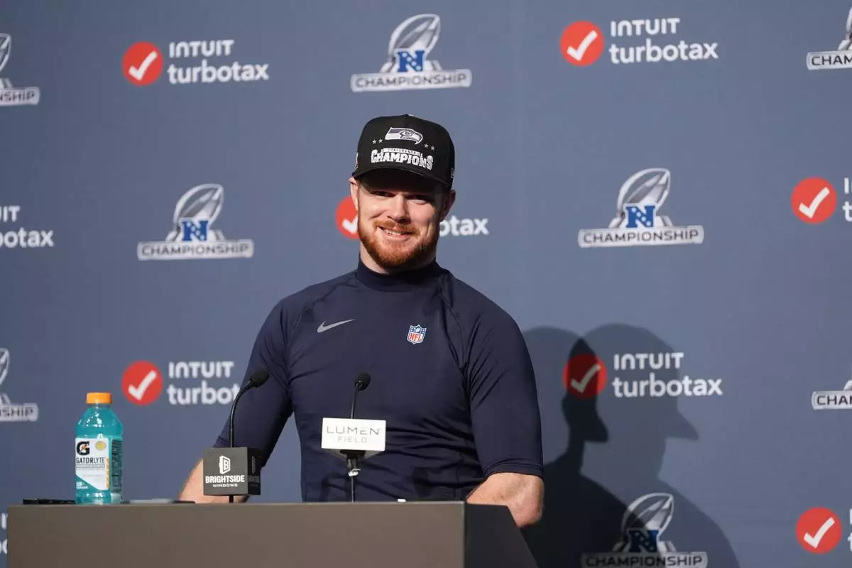 Seattle Seahawks quarterback Sam Darnold speaks during a news conference after the NFC Championship NFL football game against the Los Angeles Rams, Sunday, Jan. 25, 2026, in Seattle. (AP Photo/Lindsey Wasson)