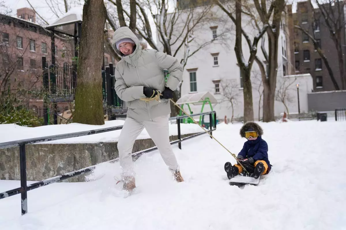 Mandy Rosenthal pulls her son Wesley, 4, on a snowboard in a small park in New York, Monday, Jan. 26, 2026. (AP Photo/Seth Wenig)
