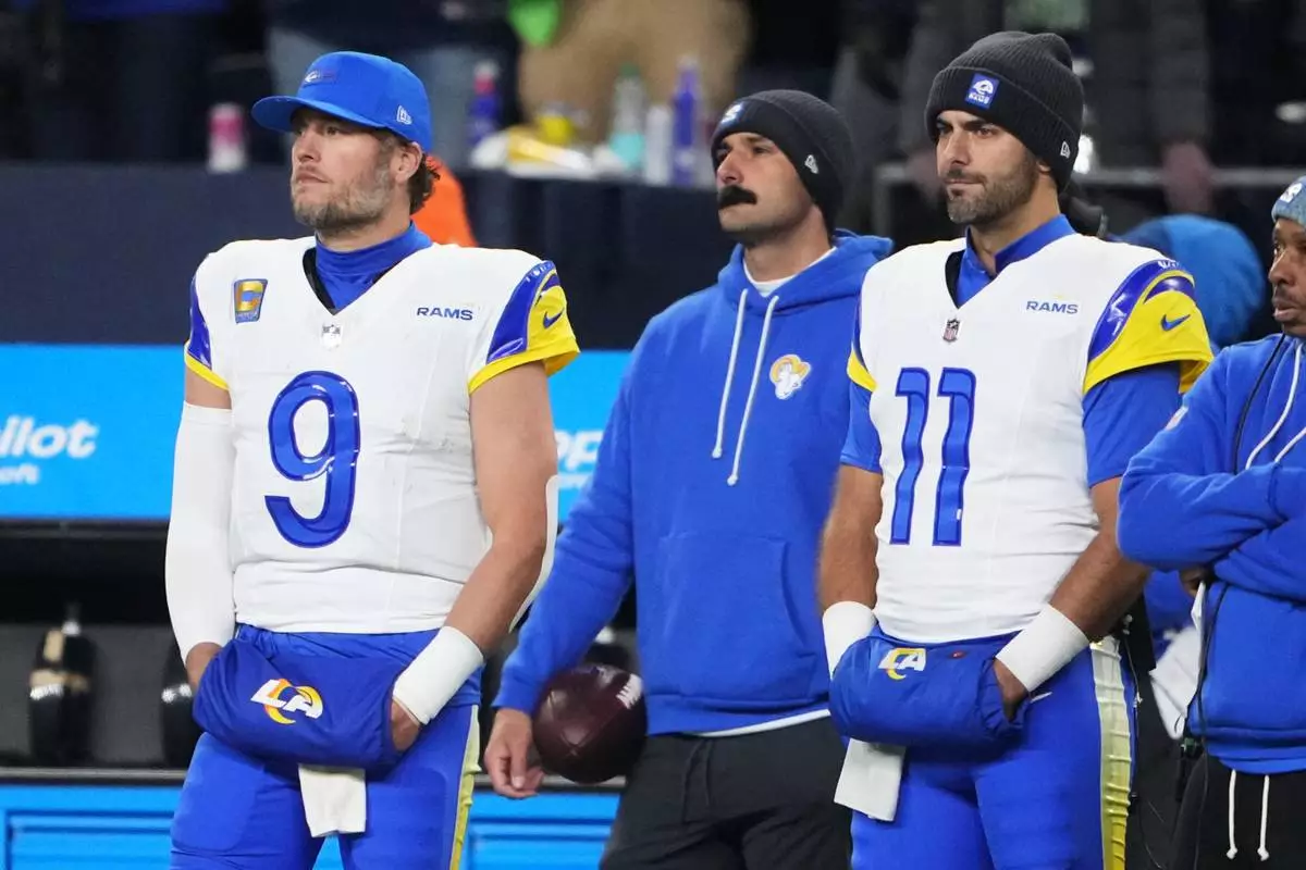 Los Angeles Rams quarterback Matthew Stafford (9) quarterback Jimmy Garoppolo (11) watch from the sideline in the closing minutes of a loss to the Seattle Seahawks in the NFC Championship NFL football game Sunday, Jan. 25, 2026, in Seattle. (AP Photo/Lindsey Wasson)