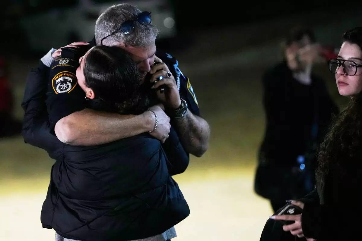A police officer hugs a family member of Israeli hostage Ran Gvili after the announcement that his remains were the last to be recovered from Gaza, at his home in the village of Meitar, southern Israel, Monday, Jan. 26, 2026. (AP Photo/Ohad Zwigenberg)