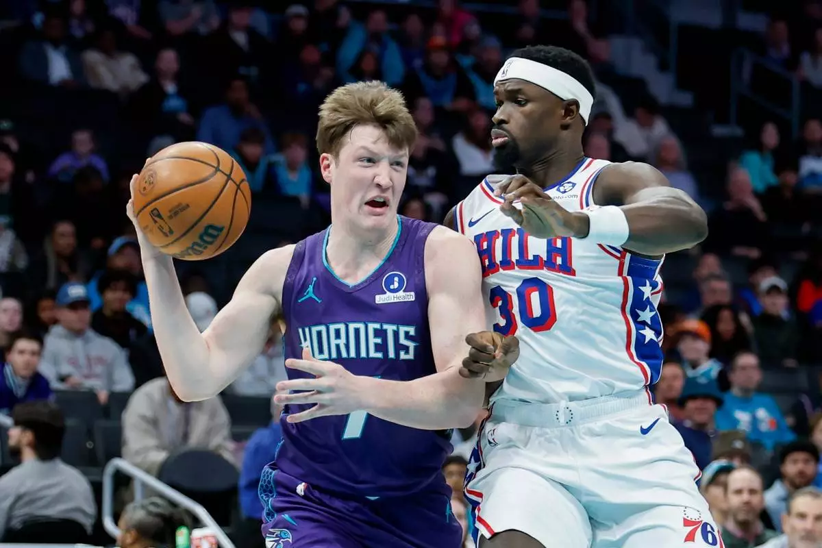 Charlotte Hornets guard Kon Knueppel, left, passes against Philadelphia 76ers center Adem Bona (30) during the first half of an NBA basketball game in Charlotte, N.C., Monday, Jan. 26, 2026. (AP Photo/Nell Redmond)