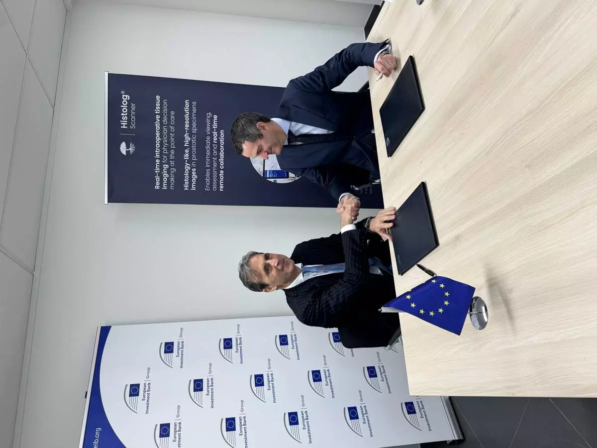 The European Investment Bank (EIB) provides €20 million in financing to SamanTree Medical, a leader in surgical imaging innovation. The financing supports the development of an advanced confocal microscopy scanner for rapid imaging of the internal microstructure of tissue samples during surgical procedures, R&D and continued development and advancement of the company's Histolog® Scanner, the first and only medical imaging device featuring massively parallel confocal microscopy. Shown: Alessandro Izzo, EIB Director (left) and Olivier Delporte, CEO of SamanTree Medical (right).