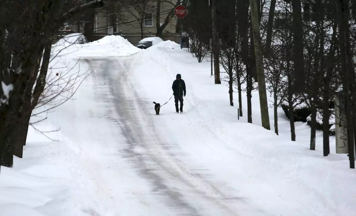 A person walks their dog in the snow after a storm in Portsmouth, N.H., Monday, Jan. 26, 2026. (AP Photo/Caleb Jones)