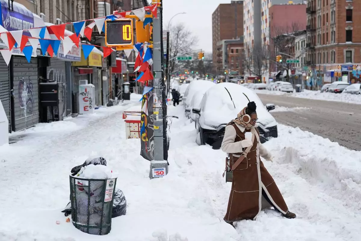 Carrie Hampton tries to navigate a snowy intersection without spilling her coffee in New York, Monday, Jan. 26, 2026. (AP Photo/Seth Wenig)