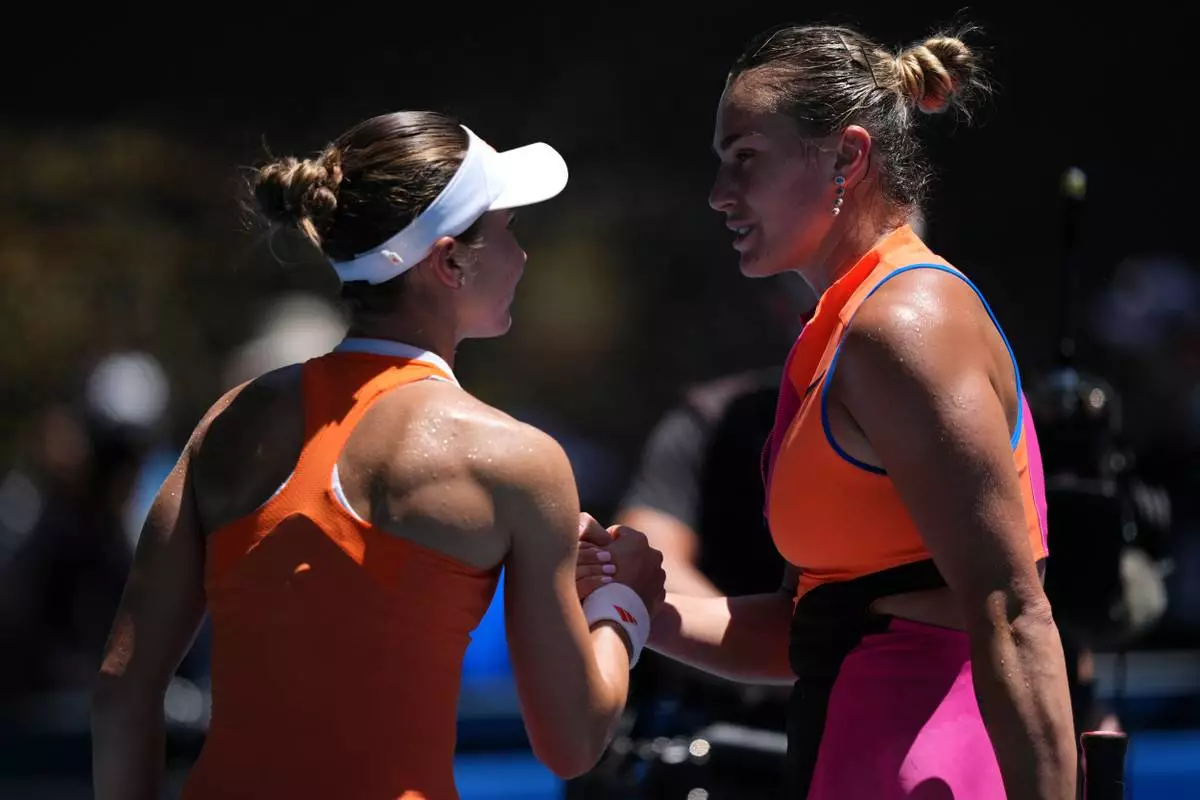 Aryna Sabalenka, right, of Belarus is congratulated by Iva Jovic of the U.S. following their quarterfinal match at the Australian Open tennis championship in Melbourne, Australia, Tuesday, Jan. 27, 2026. (AP Photo/Aaron Favila)