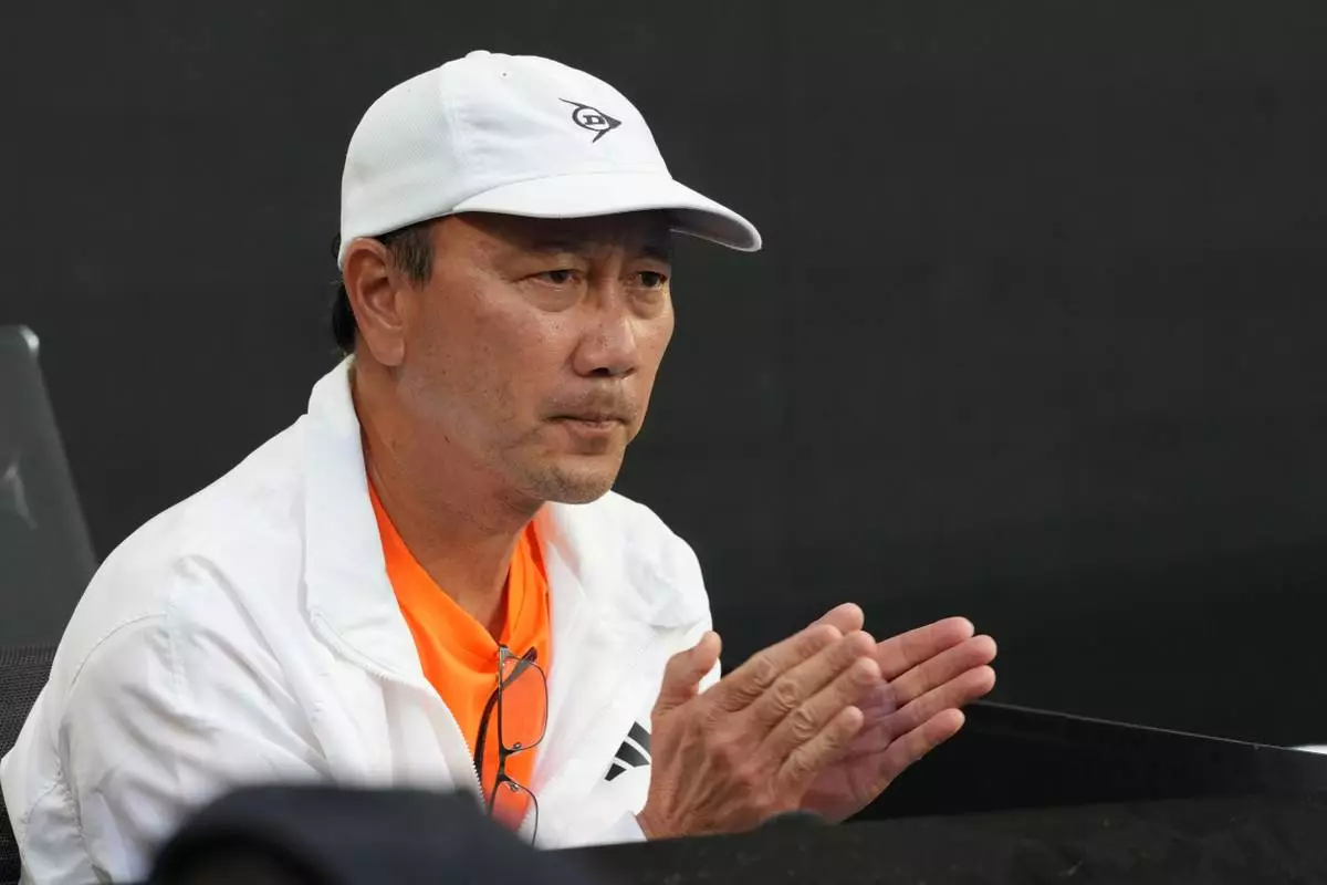 Michael Chang, coach of Learner Tien of the U.S. reacts during his fourth round match against Daniil Medvedev of Russia at the Australian Open tennis championship in Melbourne, Australia, Sunday, Jan. 25, 2026. (AP Photo/Asanka Brendon Ratnayake)