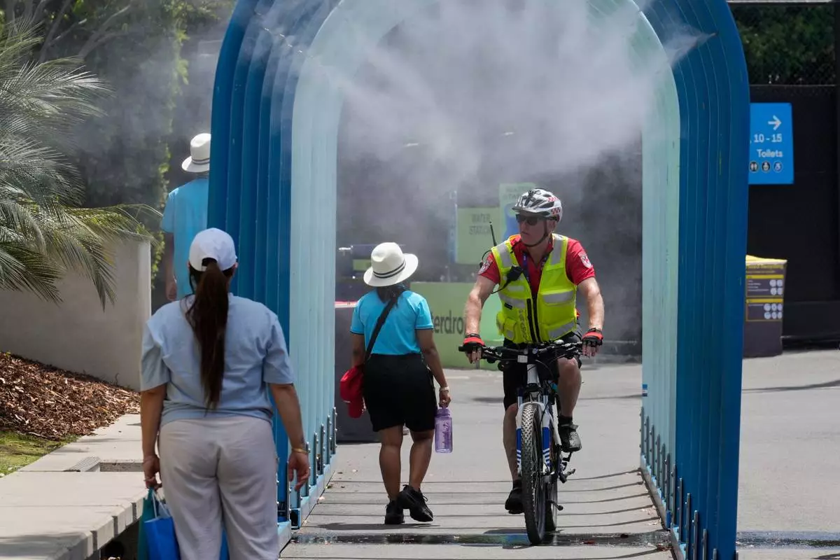 Fans walk and ride bikes through a water mister at the Australian Open tennis championship in Melbourne, Australia, Tuesday, Jan. 27, 2026. (AP Photo/Dar Yasin)