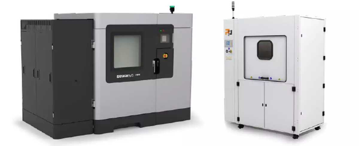 From left, Stratasys F900™ industrial printer and PostProcess® BASE Automated FDM Support Removal System.