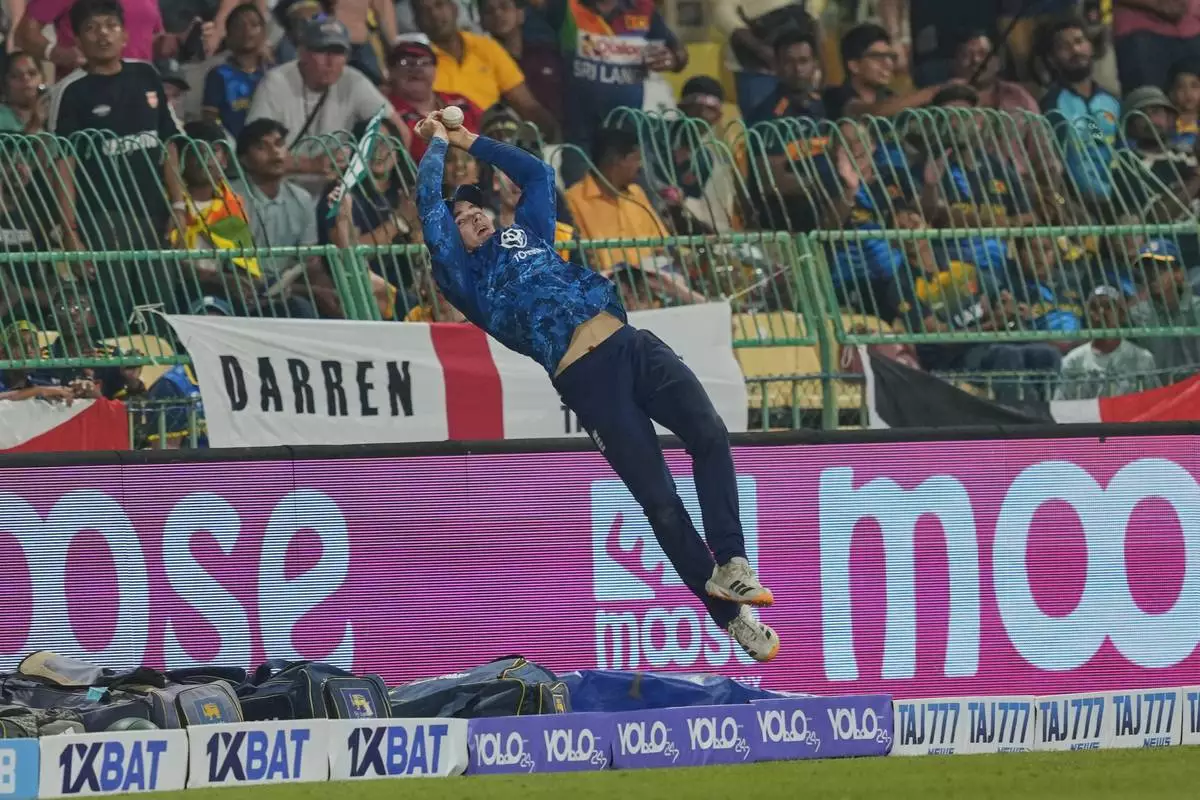 England's Jacob Bethell attempts to take a catch during the third ODI cricket match between England and Sri Lanka in Colombo, Sri Lanka, Tuesday, Jan. 27, 2026. (AP Photo/Eranga Jayawardena)