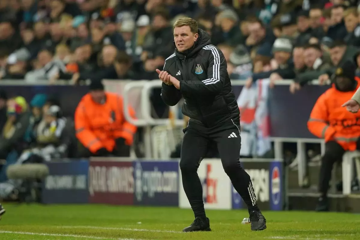 Newcastle's head coach Eddie Howe applauds during the Champions League soccer match between Newcastle and PSV in Newcastle, England, Wednesday, Jan. 21, 2026. (AP Photo/Ian Hodgson)
