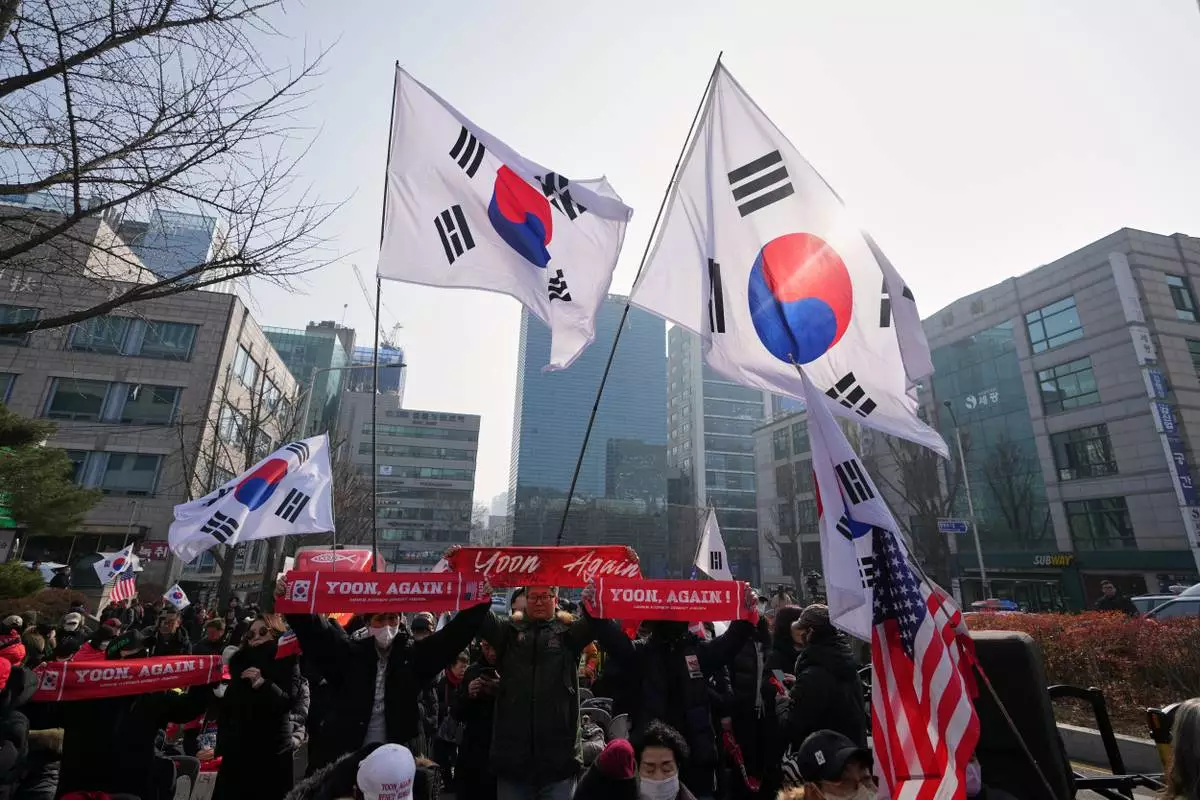 Supporters of former South Korean President Yoon Suk Yeol hold signs and flags outside Seoul Central District Court, in Seoul, South Korea, Friday, Jan. 16, 2026. (AP Photo/Lee Jin-man)