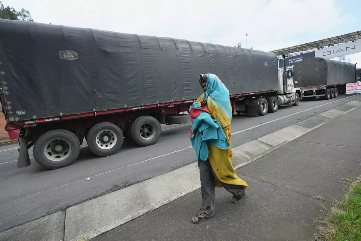 A man walks next to trucks heading to the border with Colombia, in Rumichaca, Ecuador, Friday, Jan. 23, 2026. (AP Photo/Dolores Ochoa).