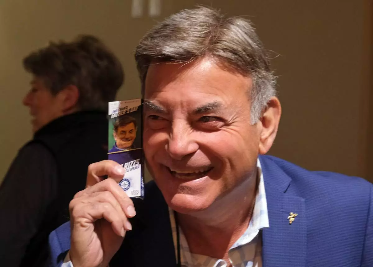 FILE - Rick Rizzs, Seattle Mariners radio broadcaster, poses with a talking bottle opener while handing them out before a baseball game against the Baltimore Orioles, June 23, 2019, in Seattle. (AP Photo/John Froschauer, File)