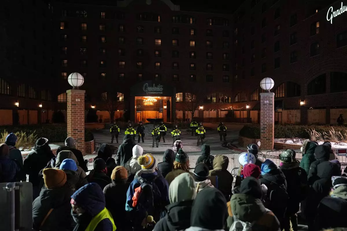 People participate during a noise demonstration outside the Graduate by Hilton Minneapolis hotel on Wednesday, Jan. 28, 2026, in Minneapolis. (AP Photo/Adam Gray)