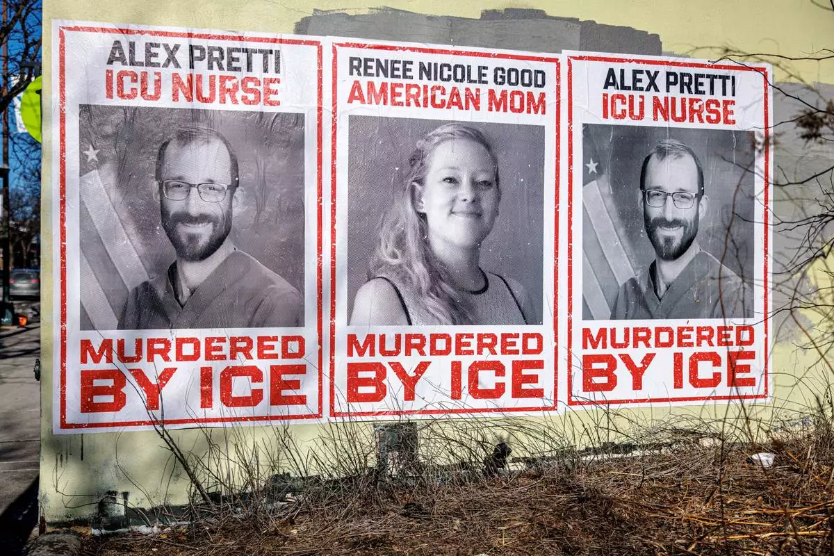 Posters depicting Alex Pretti and Renee Nicole Good are displayed on a wall near the site where Pretti, a 37-year-old ICU nurse, was fatally shot by federal immigration agents, in Minneapolis, Minn., Thursday, Jan. 29, 2026. (Kerem Yücel/Minnesota Public Radio via AP)