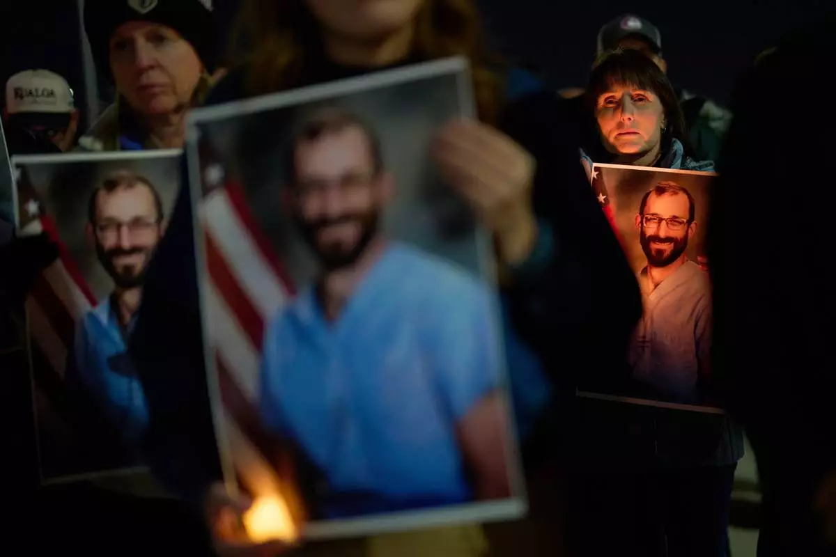 People hold up photos during a vigil for Alex Pretti, who was shot and killed by federal immigration enforcement in Minneapolis, Wednesday, Jan. 28, 2026, in Henderson, Nev. (AP Photo/John Locher)
